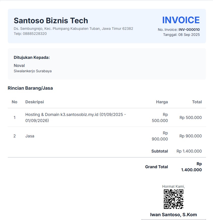 Aplikasi Invoice adalah solusi profesional untuk mempermudah pembuatan, pengelolaan, dan pelacakan faktur bisnis Anda. Dirancang untuk usaha kecil, menengah, maupun individu profesional, aplikasi ini memungkinkan Anda membuat invoice yang rapi dan profesional dalam hitungan detik, tanpa perlu keahlian desain khusus.
